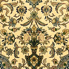 Ein strahlendes, sehr fein gemustertes Medaillon ist das Hauptelement dieses Meisterwerkes. Wenn man unter einer Mosaikkuppel steht ergibt sich für den Betrachter ein adäquates Bild. Da das Medaillon in goldgrüner Seide gearbeitet ist, funkelt es wie eine Sonne auf dem dunkelblauen Grund mit feinen Rankenwerk. Die Kartuschen Bordüre wirkt wie ein schöner Rahmen für ein grandioses Bild.